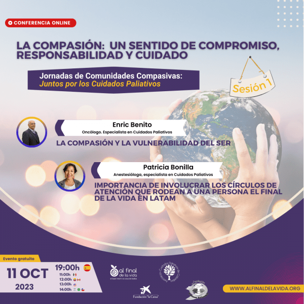 Para celebrar el Día Mundial de Cuidados Paliativos de 2023 se llevarán a cabo las Primeras Jornadas «La compasión: un sentido de compromiso, responsabilidad y cuidado» organizadas por ASOCUPAC Colombia, Al Final de la Vida España y AMIPALLIUM Colombia para visibilizar las iniciativas de comunidades compasivas y sensibilizar a la ciudadanía sobre la importancia y necesidad del cuidado de otros en la enfermedad y el final de vida.