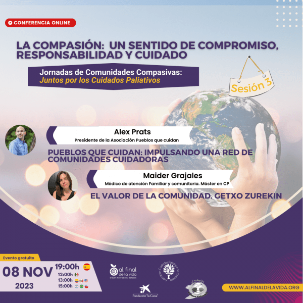Para celebrar el Día Mundial de Cuidados Paliativos de 2023 se llevarán a cabo las Primeras Jornadas «La compasión: un sentido de compromiso, responsabilidad y cuidado» organizadas por ASOCUPAC Colombia, Al Final de la Vida España y AMIPALLIUM Colombia para visibilizar las iniciativas de comunidades compasivas y sensibilizar a la ciudadanía sobre la importancia y necesidad del cuidado de otros en la enfermedad y el final de vida.